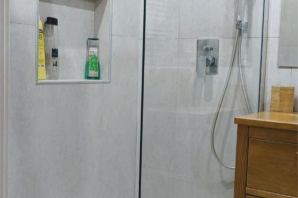 Baño moderno con plato de ducha y mampara de cristal
