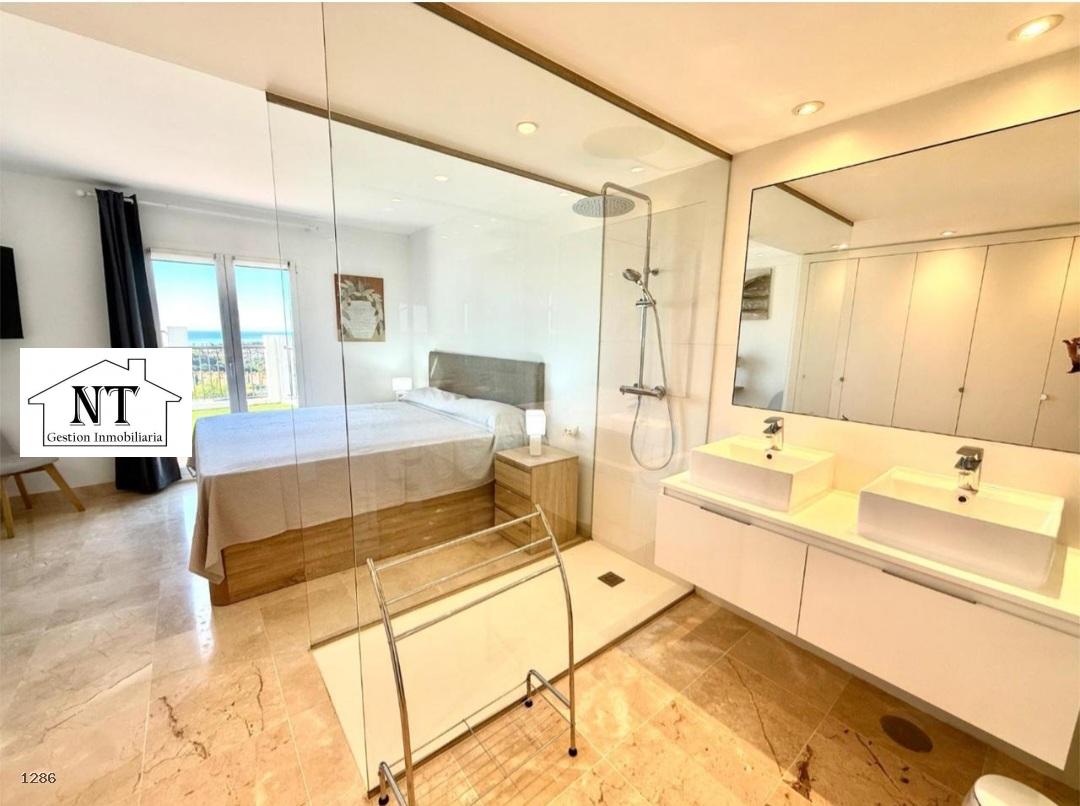 Desde la terraza se accede a un jardín privado con distintas zonas de estar y tumbonas, que aporta la sensación de vivir en una villa independiente. Además, la terraza cuenta con barbacoa, perfecta para reuniones y veladas al aire libre con el mar como telón de fondo.