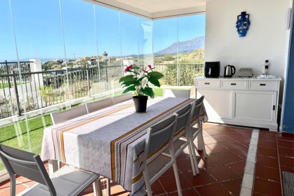 Bajo con jardín privado y vistas panorámicas al mar en Paraiso Pueblo, Benahavís