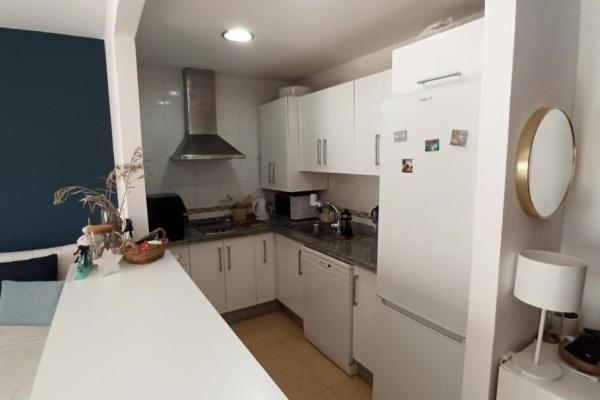 La cocina es abierta, tipo americana, con barra y taburetes, completamente equipada con electrodomésticos, incluido lavavajillas.