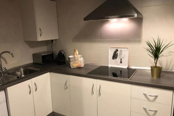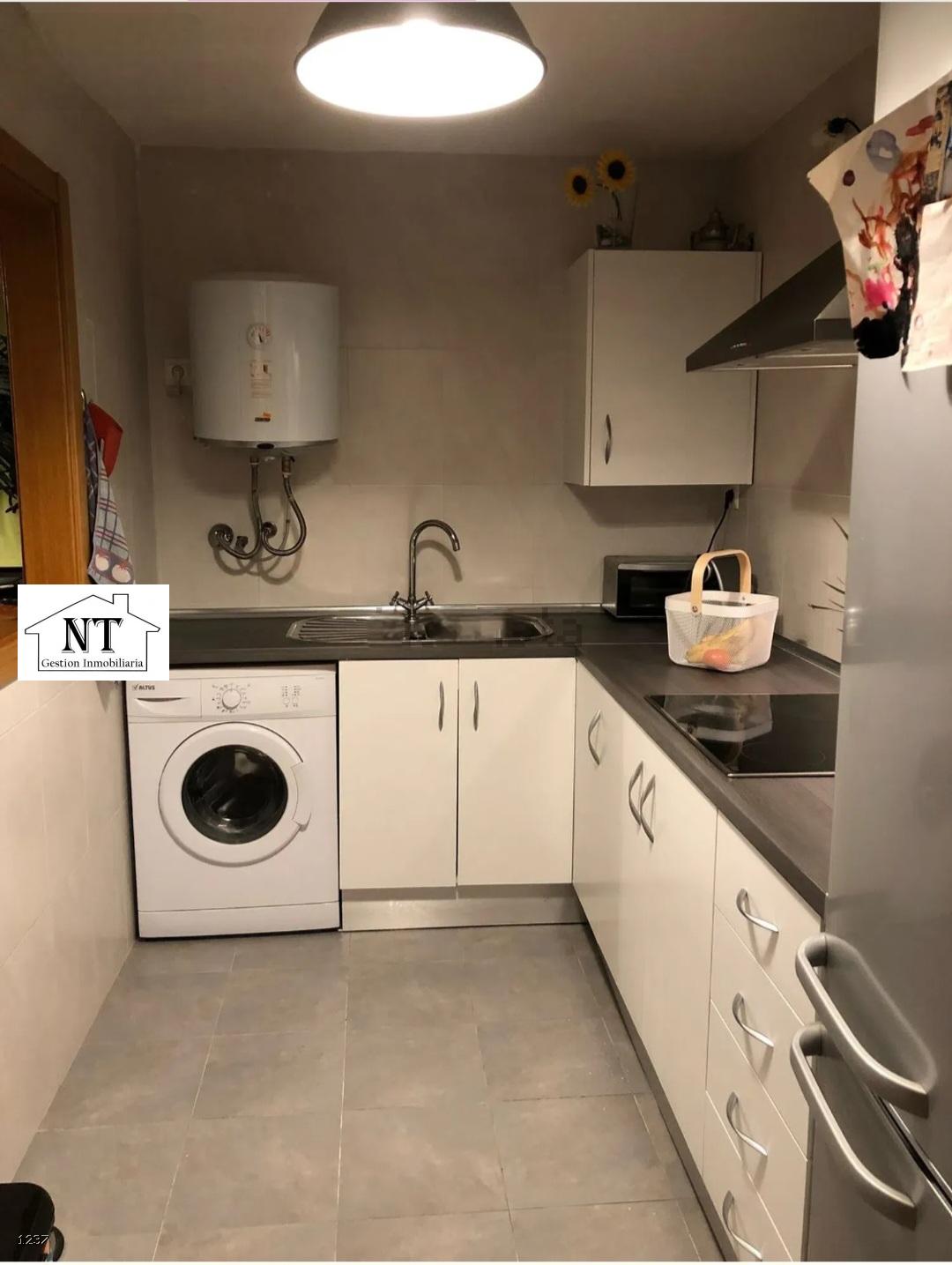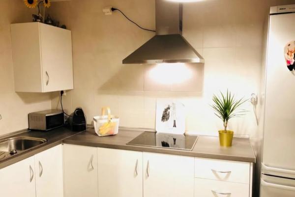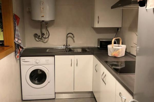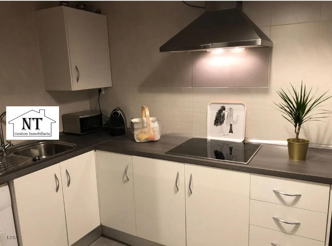 Cocina funcional, abierta al salón mediante pasaplatos, equipada con vitrocerámica de cuatro fuegos, mobiliario práctico y un diseño sencillo y moderno.