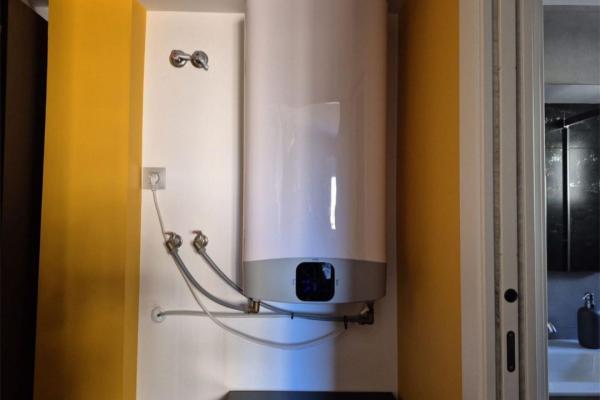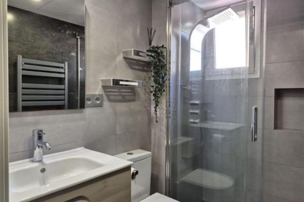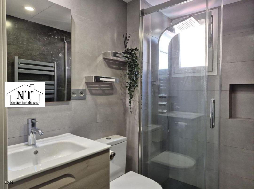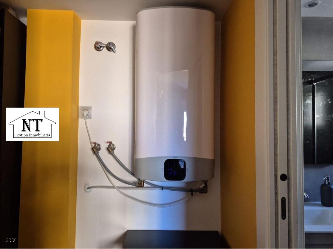 Baño: plato de ducha de resina con columna de hidromasaje y grifería de alta gama. Termo Fleck Duo 5 de 80L.